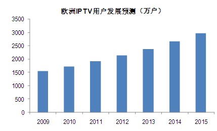 據(jù)外國(guó)咨詢公司調(diào)查顯示,因?yàn)榇笠?guī)模部署下一代接入網(wǎng),在未來(lái)5年內(nèi),歐洲IPTV用戶數(shù)將增長(zhǎng)92%,從09年的1540萬(wàn)增長(zhǎng)到2015年2960萬(wàn)人。