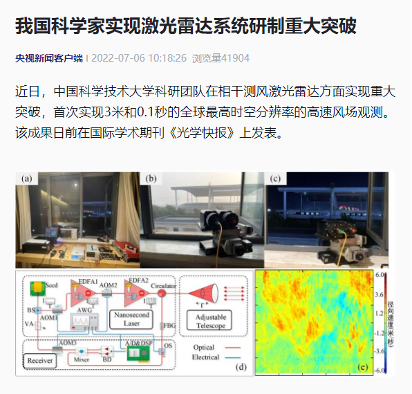 ICC訊 7 月 6 日消息,據(jù)央視新聞報道,近日,中國科學(xué)技術(shù)大學(xué)科研團隊在相干測風(fēng)激光雷達方面實現(xiàn)重大突破,首次實現(xiàn) 3 米和 0.1 秒的全球最高時空分辨率的高速風(fēng)場觀測。該成果日前在國際學(xué)術(shù)期刊《光學(xué)快報》上發(fā)表。