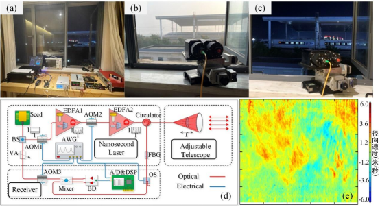 ▲ 圖 1 3 米距離分辨率相干測風(fēng)雷達實驗裝置:(a) 實驗裝置實物;(b) 白天觀測;(c) 夜間觀測;(d) 光學(xué)系統(tǒng)及電路控制示意圖;(e) 連續(xù) 5 分鐘觀測的陣風(fēng)結(jié)構(gòu)圖(時間分辨率為 1 秒)。