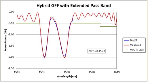以下是一個混合GFF的示例,在GFF波長范圍的上方和下方都有擴展的通帶(T> -0.5 dB)。