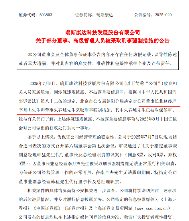 7月8日瑞斯康達(dá)發(fā)布公告稱,公司董事長兼總經(jīng)理李月杰和董事朱春城因涉嫌違規(guī)披露、不披露重要信息罪,北京市公安局朝陽分局決定于7月5日對60歲的李月杰和朱春城采取刑事強(qiáng)制措施,其中74歲的朱春城已被取保候?qū)彙?