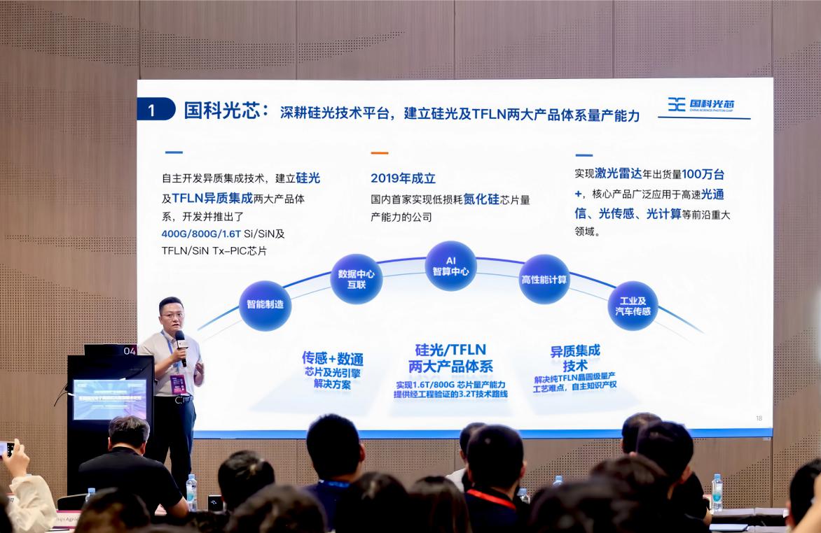 展會(huì)期間,國(guó)科光芯數(shù)通事業(yè)部總經(jīng)理朱宇博士,于“高性能光電子集成芯片前沿技術(shù)論壇”進(jìn)行關(guān)于《硅光異質(zhì)集成技術(shù)發(fā)展與應(yīng)用》的主題演講。報(bào)告主要從硅光異質(zhì)集成技術(shù)發(fā)展的市場(chǎng)背景、技術(shù)發(fā)展歷程、商業(yè)化進(jìn)展等多個(gè)維度,介紹并分析硅光異質(zhì)集成為產(chǎn)業(yè)帶來的技術(shù)優(yōu)勢(shì)和未來發(fā)展趨勢(shì)及商業(yè)化機(jī)會(huì)。