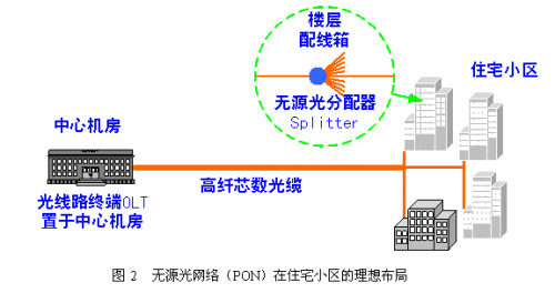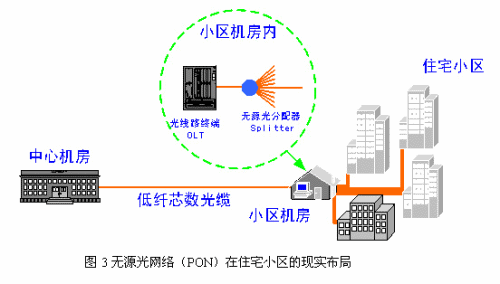 圖3是無源光網(wǎng)絡(PON)在住宅小區(qū)的現(xiàn)實布局:OLT和Splitter均放置在小區(qū)機房里。這種現(xiàn)實布局優(yōu)點是:中心機房至住宅小區(qū)只需要低芯數(shù)光纜,現(xiàn)有光纜資源就能滿足需要;整個住宅小區(qū)接入線路均在小區(qū)機房配線,容許用戶自由選擇不同電信運營商,對電信運營商而言網(wǎng)絡非常容易放號、維護和管理;由于接入設備和配線架同在小區(qū)機房,無疑顯著提高設備端口利用率,接入設備可以根據(jù)接入用戶數(shù)增加而逐步擴容。但這種現(xiàn)實的布局也有其明顯的缺點:首先,丟棄PON的網(wǎng)絡結構是無源網(wǎng)絡的最大優(yōu)勢,中心機房至用戶網(wǎng)絡還是有源網(wǎng)絡;其次,并沒有因為PON而節(jié)約光纜資源;再者,PON設備成本高、網(wǎng)絡結構復雜。
