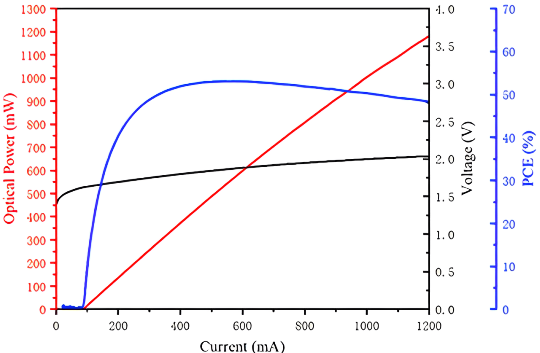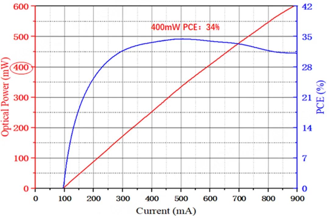 ?高效率:芯片最高電光轉(zhuǎn)換效率達(dá)到55%,在700mW工作條件下,電光轉(zhuǎn)換效率依然保持在53%;模塊400mW工作條件下,電光轉(zhuǎn)換效率超過34%;