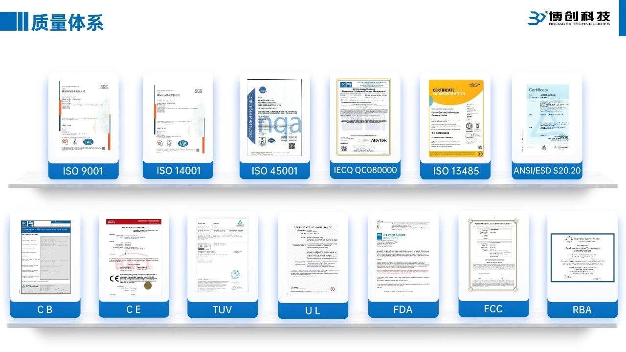 多年來,博創(chuàng)科技秉持“創(chuàng)新求實、客戶滿意、持續(xù)改進、追求卓越”的質量方針,將精益化、質量化滲透到整個公司的各個管理環(huán)節(jié)。從原料到生產(chǎn),嚴把質量關,在實踐中不斷完善并形成扎實、堅定、誠信、可靠的質量體系。批批檢驗合格、次次抽檢合格,無重大質量事故,鑄就了高品質、值得客戶信賴的產(chǎn)品。在國內外官方審計檢查中體現(xiàn)出高水平、高標準、高要求,創(chuàng)科技及其分子公司先后通過ISO9001、ISO14001、ISO45001、ISO13485、IECQ QC080000、RBA等質量管理體系認證。