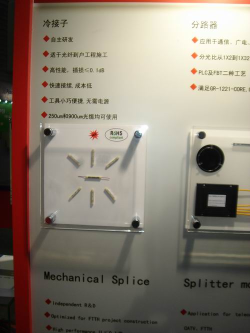日海通訊設備有限公司在本次世界電信展上展出了產(chǎn)品光纖冷接子和分路器,其中冷接子由日海自主研發(fā),適于光纖到戶工程,插入損耗≤0.1dB,小巧便捷、無需電源,250um和900um光纜均可使用。
