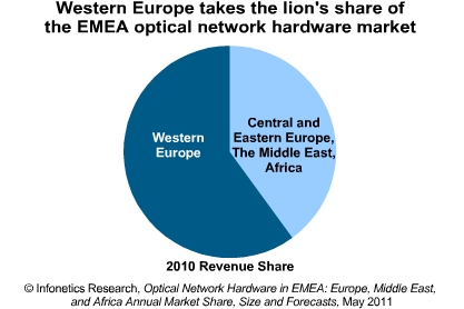 * 2010年,西歐地區(qū)主導(dǎo)了整個EMEA光網(wǎng)絡(luò)硬件市場,西歐地區(qū)開支占EMEA市場的60%;