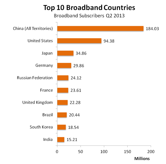 Q213的全球十大寬帶用戶國排名跟Q113相比沒有變化。中國的寬帶用戶總數(shù)比美國、日本、德國和俄羅斯加起來的總數(shù)還大。