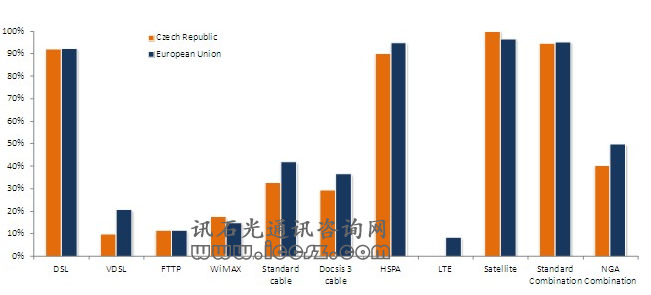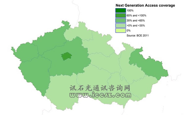《2011歐洲寬帶覆蓋》調(diào)研報(bào)告顯示,捷克共和國(guó)基本寬帶覆蓋達(dá)95%,也就是說(shuō),只要他們想用,就可以獲得至少144kbps。大約41%的能夠使用超高速寬帶(也成為NGA,即下一代接入)。在調(diào)研的29個(gè)國(guó)家中(歐盟27國(guó)和挪威、冰島),96%能夠獲得基本寬帶,超過(guò)50%(一半國(guó)家走向2020數(shù)字天堂目標(biāo))能夠獲得超高速。
