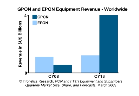 預(yù)計(jì)從2008年到2013年間,全球范圍內(nèi)“光進(jìn)銅退”將繼續(xù)推動(dòng)PON設(shè)備市場(chǎng)發(fā)展,復(fù)合年均增長(zhǎng)率(CAGR)將高達(dá)23%。
