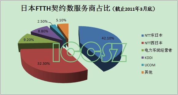 * FTTH契約數(shù)為2023.6萬,相比去年年底增長(zhǎng)率為2.3%。各服務(wù)供應(yīng)商份額相比2010年底基本持平,東西NTT占比74.4%(下滑0.1個(gè)百分點(diǎn)),電力系統(tǒng)經(jīng)營(yíng)者占比9.2%(上升0.1個(gè)百分點(diǎn)),KDDI占比8.8%(上升0.2個(gè)百分點(diǎn));