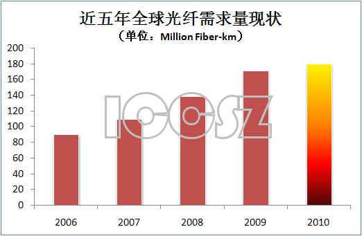 2010年,全球光纖光纜需求量為1.8億芯公里,相比2009年增長了5%。中國以外市場需求量增長了14%,從2009年的9100萬芯公里增至1.04億芯公里。