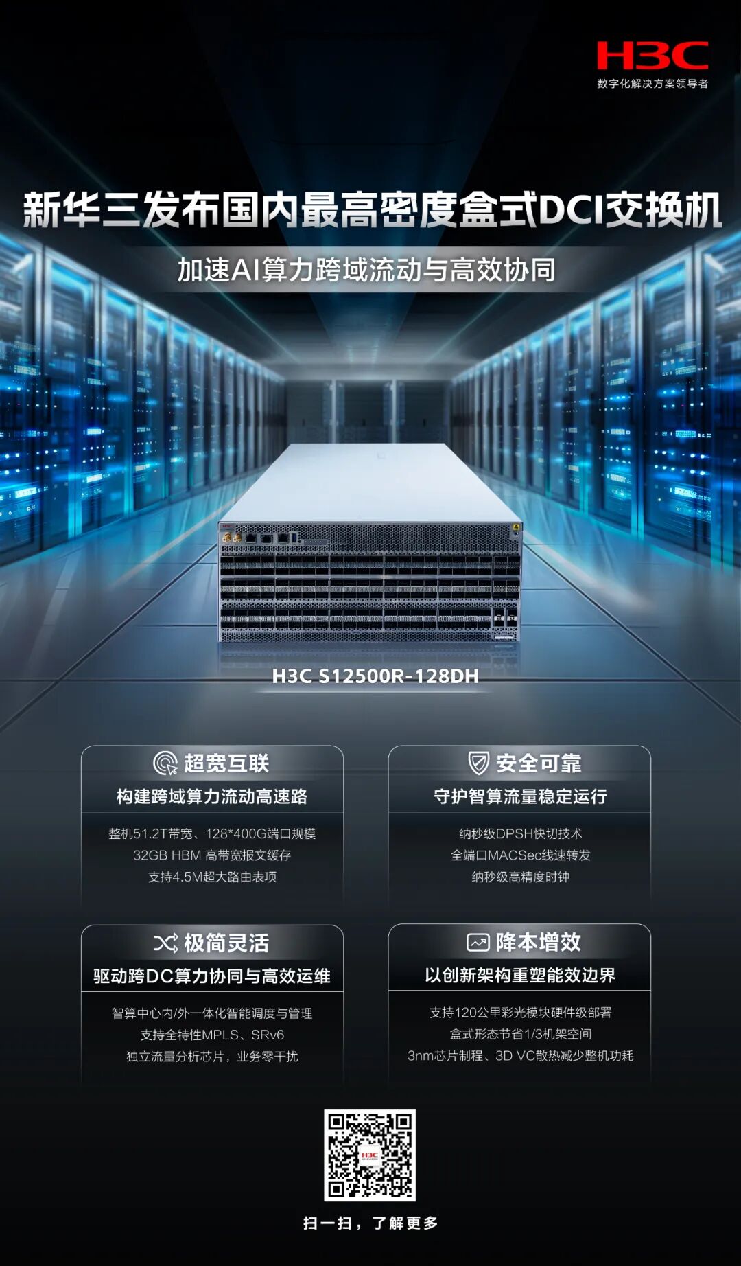隨著AI大模型的迅猛發(fā)展與智算中心規(guī)模的持續(xù)擴(kuò)張,跨數(shù)據(jù)中心互聯(lián)(DCI,Data Center Interconnect)正從“連接業(yè)務(wù)”邁向“連接算力”的新階段。算力在更大地域范圍內(nèi)的分布與協(xié)同,正在對(duì)網(wǎng)絡(luò)帶寬、時(shí)延、能效與可靠性提出全新要求。為應(yīng)對(duì)這一趨勢(shì),新華三推出全新高密度盒式DCI交換機(jī)H3C S12500R-128DH,以極致性能和創(chuàng)新架構(gòu)重構(gòu)DCI互聯(lián)能力,助力智算中心在跨域算力流動(dòng)中實(shí)現(xiàn)更高速、更穩(wěn)定、更高效的連接。