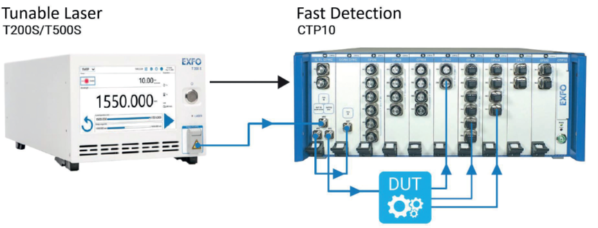 圖2. 掃頻激光法光譜表征儀器的示例,包括可調(diào)激光器(來自EXFO的T200S/T500S)和集成在器件測試平臺(來自EXFO的CTP10)中的一系列功率計(jì)。