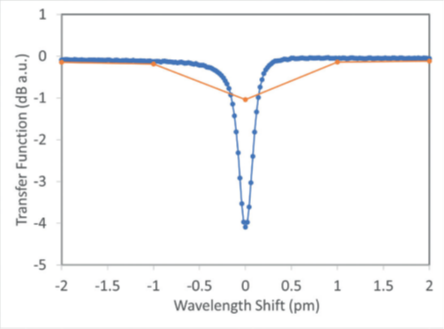 圖3. 使用CTP10器件測試平臺測量的高Q值環(huán)形諧振腔的光譜響應(yīng),分辨率分別為1 pm(紅色)和20 fm(藍(lán)色)。器件由CEA-Leti提供。