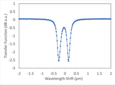 圖4. 以20 fm光譜分辨率測量的模式分裂光譜事件示例(與圖3 中的同一環(huán)形諧振腔),使用CTP10組件測試平臺進(jìn)行測量。設(shè)備由CEA-Leti提供。