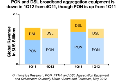 “正如我們平常所見,全球寬帶匯聚市場一季度表現(xiàn)較為疲軟。盡管日本和其他亞太地區(qū)呈現(xiàn)健康增長,但中國以太網(wǎng)PON開支43%的驟降,導致了亞太地區(qū)該季下降三分之一強。在中國的下降主要是由于今年朝FTTH的轉換和上季度創(chuàng)紀錄增長太高。另一個嚴重下拉整個市場的原因是,EMEA DSL收入連續(xù)第三個季度下滑。這一地區(qū)由于受經(jīng)濟環(huán)境不穩(wěn)定的影響,接入網(wǎng)絡升級項目已經(jīng)停滯不前了。”Infonetics寬帶接入和視頻首席分析師Jeff Heynen說。