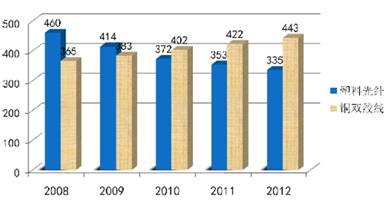 圖2. 塑料光纖與銅雙絞線的成本趨勢(shì)