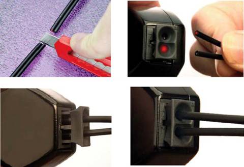 塑料光纖的施工連接非常便利,如圖3所示,光纖端面以一把裁紙刀切割,插入收發(fā)模塊即可實(shí)現(xiàn)耦合連接。