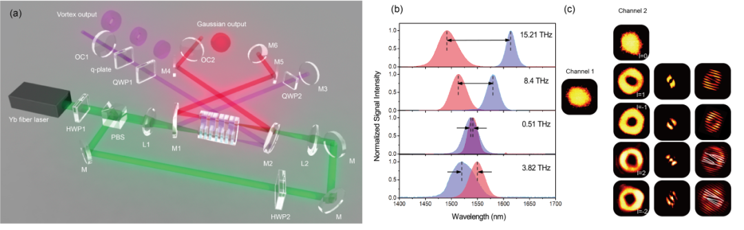 該課題組的設(shè)計(jì)思想是通過激發(fā)不同周期的單一準(zhǔn)相位匹配周期極化鈮酸鋰晶體,構(gòu)建單晶體雙通道OPOs,實(shí)現(xiàn)不同波長的獨(dú)立輸出;在腔內(nèi)引入不同q波片實(shí)現(xiàn)不同階數(shù)的渦旋光束輸出。