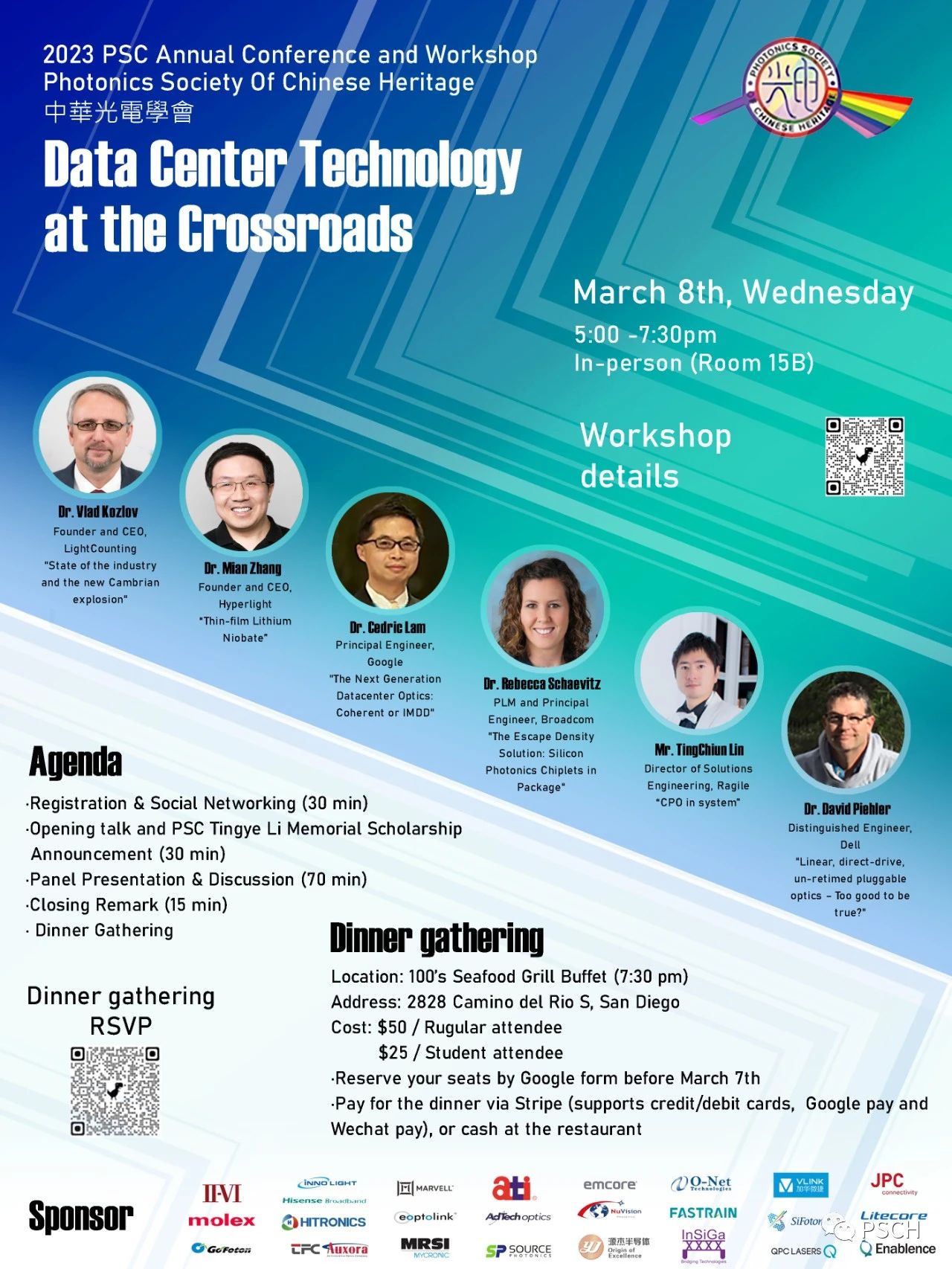3月5-9日,2023年度美國光網(wǎng)絡與通信研討會及博覽會(OFC)將在加州圣地亞哥舉辦,吸引全球各地光通信行業(yè)人士參與。展會期間,PSC中華光電學會將在美國太平洋時間3月8日下午5:00舉辦2023年度研討會。本屆OFC中,我們將重新舉辦線下研討會,并在會后舉辦晚宴交流會,誠邀光通訊、光電子領域企業(yè)人士、科研院校學者及投資行業(yè)朋友預約參加。研討會詳細信息及晚宴預約報名請掃描海報中二維碼。