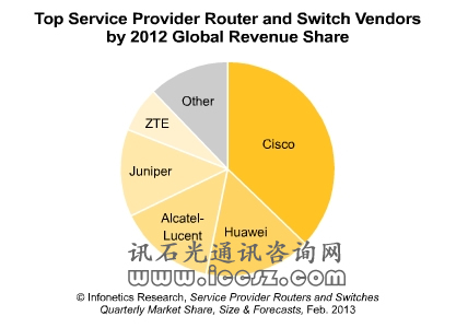 就路由器的市場(chǎng)份額而言,思科在2012年繼續(xù)保持榜首的位置,不過(guò)華為和阿爾卡特朗訊在2012年第四季度相關(guān)收入大增之后市場(chǎng)份額也隨之?dāng)U大。