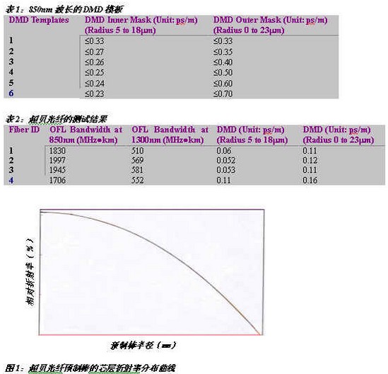 10G以太網(wǎng)標(biāo)準(zhǔn)IEEE802.3ae的通過,將一個(gè)10G以太網(wǎng)市場真實(shí)的呈現(xiàn)出來。開發(fā)符合萬兆以太網(wǎng)標(biāo)準(zhǔn)的通訊產(chǎn)品已是當(dāng)務(wù)之急。長飛光纖光纜有限公司應(yīng)用PCVD方法,通過精確控制芯層折射率分布,和有效消除中心凹陷,已經(jīng)成功的開發(fā)出了符合TIA/EIA-492AAAC標(biāo)準(zhǔn),激光優(yōu)化的50/125mm梯度折射率分布多模光纖產(chǎn)品。滿注入帶寬和DMD測試結(jié)果表明,在850nm波長,該光纖可以支持10Gigabit網(wǎng)絡(luò)系統(tǒng)300米以上的傳輸距離。同時(shí),該光纖同樣支持10Gigabit的Fibre Channel和10Gigabit的OIF(Optical Internetworking Forum)標(biāo)準(zhǔn),并兼容低速率LED光源的網(wǎng)絡(luò)傳輸。