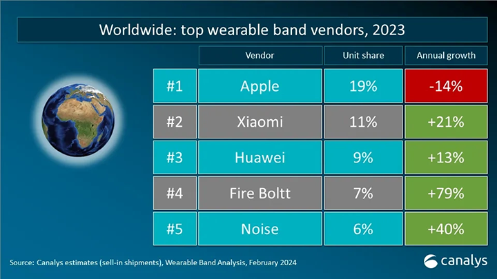 ICC訊 4 月 11 日消息,根據(jù)市場調(diào)查機構(gòu) Canalys 今日發(fā)布的最新報告,2023 年,全球可穿戴腕帶設(shè)備市場實現(xiàn) 1.4% 的溫和增長,出貨量達 1.85 億臺。該機構(gòu)預(yù)測 2024 年,全球可穿戴腕帶市場將增長 7%。