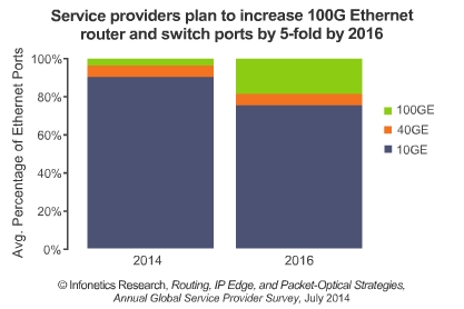 ICCSZ訊 近日,市場調研公司Infonetics發(fā)布其2014年路由、IP邊緣和分組光策略:全球服務提供商調查報告。調查的重點是聚焦運營商計劃從物理路由器走向軟件路由,以及100GE的采用、分組光傳輸系統(tǒng)(P-OTS)的使用等。