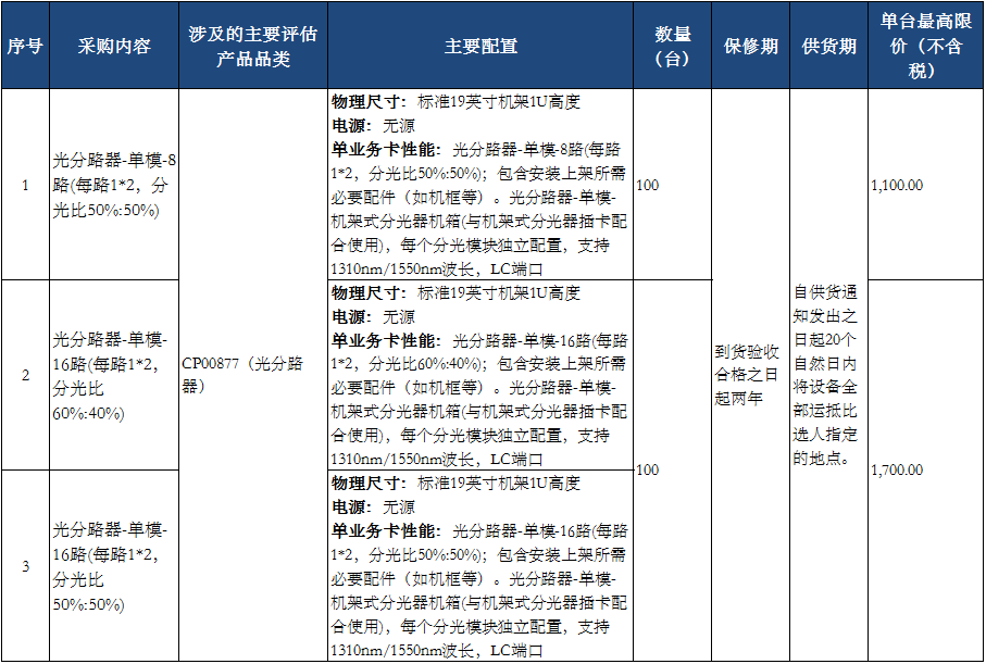 ICC訊 近日,中國電信發(fā)布中國電信天翼云2023年多節(jié)點(diǎn)分光器采購項(xiàng)目,計(jì)劃采購本項(xiàng)目所需的200臺(tái)光分路器設(shè)備及相關(guān)服務(wù)。采購內(nèi)容及分包劃分情況如下: