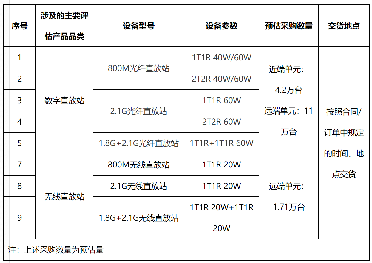 本次采購(gòu)的直放站產(chǎn)品包括:數(shù)字直放站和無(wú)線直放站,預(yù)估采購(gòu)總規(guī)模為16.91萬(wàn)臺(tái),該次采購(gòu)不劃分標(biāo)包,具體采購(gòu)詳情見(jiàn)下表: