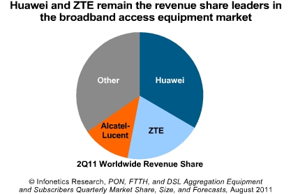 ※二季度,華為和中興繼續(xù)領(lǐng)頭整個(gè)寬帶接入設(shè)備市場(chǎng),華為的收入份額占據(jù)全球總收入的1/3。