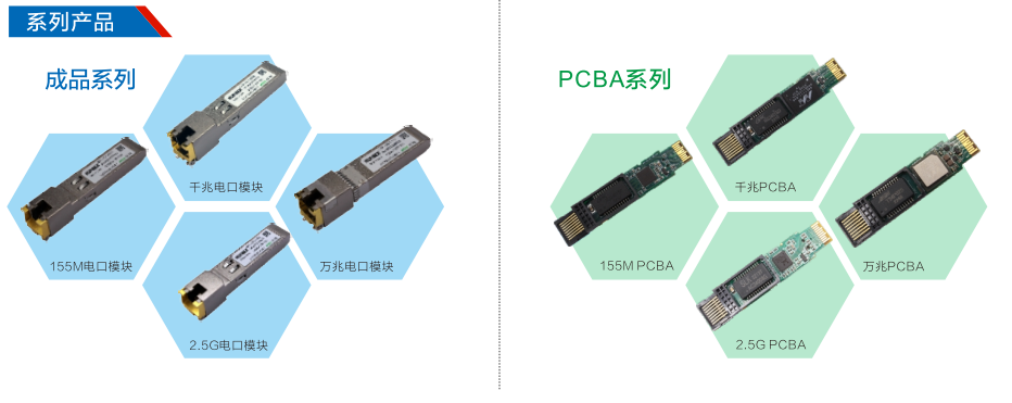 目前光元威訊可供應(yīng)種類豐富、性能穩(wěn)定的電口模塊,產(chǎn)品分為商業(yè)級(jí)和工業(yè)級(jí)兩大類,涵蓋155M/1G/2.5G/10G全系列及各種主流方案,其中2.5G、10G電口模塊深受行業(yè)客戶使用認(rèn)可。