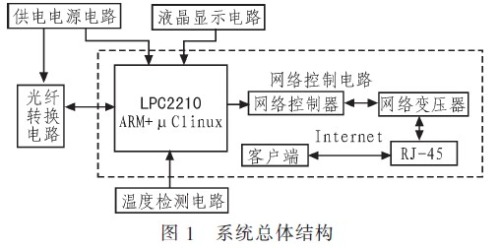 該系統(tǒng)采用標準機架式結(jié)構(gòu),便于網(wǎng)管模塊對各個光電轉(zhuǎn)換模塊統(tǒng)一管理和供電。系統(tǒng)主要可分為光電轉(zhuǎn)換電路、網(wǎng)管控制電路、溫度檢測電路、液晶顯示電路和供電電源電路設計,系統(tǒng)整體結(jié)構(gòu)圖如圖1所示。