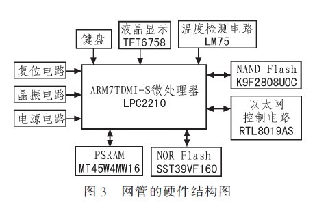 網(wǎng)管控制電路部分包括ARM最小系統(tǒng),以太網(wǎng)接口電路,鍵盤、LCD接口電路和溫度檢測電路,其硬件結(jié)構(gòu)圖如圖3所示。采用LPC2210處理器進行控制,該處理器是NXP公司16/32位144引腳ARM7TDMI-S微控制器,支持實時仿真和嵌入式跟蹤的處理器,資源豐富,應用廣泛。復位電路使用了帶I2C存儲器的監(jiān)控芯片CAT1025JI-30,復位門檻電壓3.0~3.15 V,提高了系統(tǒng)的可靠性。該處理器片內(nèi)只有16 KB片內(nèi)靜態(tài)RAM,需要擴展RAM,本系統(tǒng)擴展了8 MB的PSRAM(MT45W4MW16)作為程序的運行空間。該控制器沒有片內(nèi)Flash,因此需要外部擴展存儲器,本系統(tǒng)所擴展的存儲器有2 MB的NOR Flash(SST39VFl60),用來存儲引導程序,系統(tǒng)啟動時引導內(nèi)核和文件系統(tǒng)。16MB的NAND Flash(K9F2808-UOC),用來存儲μCLinux內(nèi)核,文件系統(tǒng)和應用程序。采用了2.2英寸的TFT6758液晶模塊,其工作電壓為 3.3 V,與整個系統(tǒng)的供電相同,便于供電。為了得到更高的數(shù)據(jù)傳輸速率,采用16位總線接口。溫度檢測電路以溫度傳感器LM75為核心,通過I2C接口和 LPC2210連接。LM75可測量的溫度為-55~125℃,工作電壓為3.3~5.5 V,可以將溫度直接轉(zhuǎn)換為數(shù)字值,通過微控制器直接讀取,使用方便。