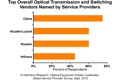 Infonetics光學(xué)首席分析師Andrew Schmitt:“我們最新的研究報(bào)告給我們呈現(xiàn)一張圖表——在光分組設(shè)備,誰(shuí)是服務(wù)供應(yīng)商眼中的領(lǐng)導(dǎo)者。在我們的調(diào)查得票率中,Ciena、阿朗、思科和華為高居前列。 ”