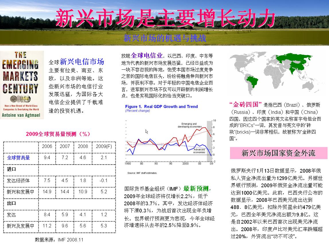 隨著電信業(yè)的迅速發(fā)展,歐美等國家和地區(qū)的電信市場已經(jīng)趨于飽和,電信業(yè)務(wù)收入增長乏力。在此情況下,歐美電信巨頭紛紛將目光投向潛力巨大的新興市場,期望電信業(yè)蓬勃發(fā)展的這塊市場能緩解本土市場收入、利潤增長雙乏力的壓力。
