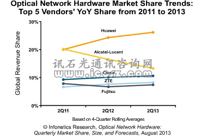 ICCSZ訊 日前,市場研究公司Infonetics發(fā)布最新的2013年2季度光網(wǎng)絡(luò)硬件市場份額與初步分析報告。