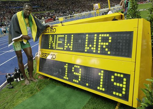 第二槍比賽順利開(kāi)始,第五道的博爾特反應(yīng)時(shí)間為0.133秒時(shí)所有選手中最快的,而起身后的銜接博爾特也極為完美,剛一入彎便甩開(kāi)了第六道的愛(ài)德華多,剛剛完成60米外面三道的選手已經(jīng)被博爾特甩在身后。進(jìn)入直道后,博爾特沒(méi)有松勁而是咬緊牙關(guān)全力沖向終點(diǎn),在距離終點(diǎn)線(xiàn)前20米處博爾特已經(jīng)確立了至少10米的優(yōu)勢(shì)。最終,博爾特以19秒19的恐怖成績(jī)率先沖線(xiàn),從而在收獲個(gè)人第二枚世錦賽獎(jiǎng)牌的同時(shí)也再次打破世界紀(jì)錄。