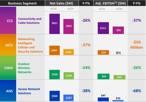 OWN為移動(dòng)網(wǎng)絡(luò)提供無(wú)線基礎(chǔ)設(shè)施,包括宏和小蜂窩站點(diǎn)解決方案。OWN部門(mén)2024年第一季度的銷(xiāo)售額為1.96億美元,同比下降24%,原因是產(chǎn)品需求仍然較低,而運(yùn)營(yíng)商則在努力消化現(xiàn)有庫(kù)存。DAS業(yè)務(wù)為場(chǎng)館、校園和企業(yè)內(nèi)部的蜂窩基礎(chǔ)設(shè)施提供解決方案。康普沒(méi)有公布DAS的銷(xiāo)售數(shù)據(jù),但其N(xiāo)ICS部門(mén)第一季度的銷(xiāo)售額下降了37%,降至1.8億美元。