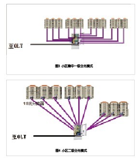 在分光方式上,運(yùn)營商可根據(jù)建筑物的形態(tài)和用戶分布,靈活選擇一級或二級分光,總體的原則為:用戶密度很低的住宅或工業(yè)園區(qū),盡量選擇在小區(qū)集中分光,以提高PON端口和分光器的利用率;用戶密度較低的住宅或園區(qū),可選擇先在小區(qū)內(nèi)一級分光,在樓內(nèi)做二級分光;用戶密度中等的小高層住宅,可選擇樓內(nèi)一級集中分光;用戶密度較高的小高層塔樓或超高住宅,可選擇樓內(nèi)二級分光。