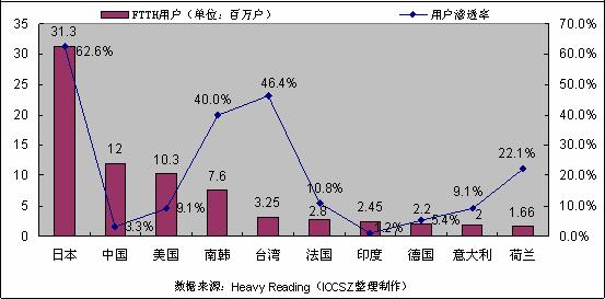 國內(nèi)外FTTH啟動情況比較良好。韓國、日本是目前FTTH工程啟動最多的國家,根據(jù)heavy reading的預(yù)測,到2011年,韓國和日本的FTTH市場滲透率將分別達(dá)到40.0%和62.6%,大陸和臺灣將分別達(dá)到3.3%和44.4%,美國將達(dá)到9.1%。其他國家參見下圖。