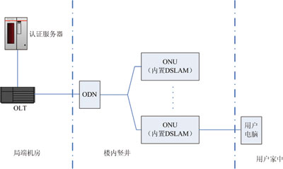 EPON網(wǎng)絡(luò)中,OLT上行認證服務(wù)器進行個人客戶的帳號認證,下行通過分光器、ONU和DSLAM設(shè)備與用戶家中的電腦相連接,從局端到ONU全部采用光接入的方式,保障用戶的私密性、傳輸可靠性。該方案根據(jù)設(shè)備集成情況不同,可以分成以下兩種情況。