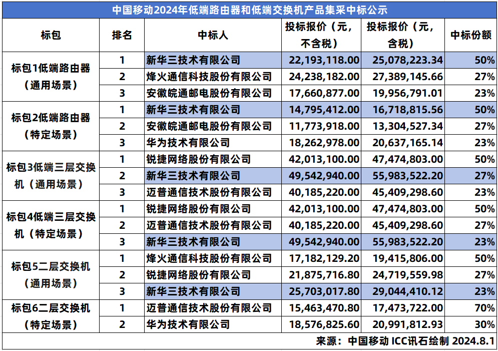 ICC訊 8月1日,中國(guó)移動(dòng)2024年低端路由器和低端交換機(jī)集中采購(gòu)結(jié)果公布。新華三、華為、銳捷、烽火、邁普、皖通郵電六家中標(biāo),項(xiàng)目總中標(biāo)金額約為180,985,182.30元(含稅),詳情如下: