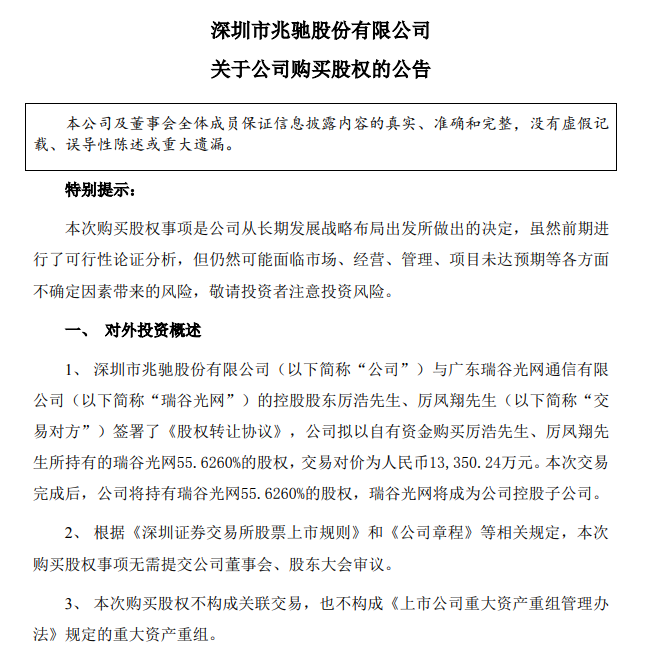 根據(jù)公告,兆馳股份與瑞谷光網(wǎng)的控股股東厲浩先生、厲鳳翔先生簽署了《股權(quán)轉(zhuǎn)讓協(xié)議》,公司擬以自有資金購(gòu)買厲浩先生、厲鳳翔先生所持有的瑞谷光網(wǎng)55.6260%的股權(quán),交易對(duì)價(jià)為人民幣13,350.24萬(wàn)元。