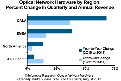 l 全球光網(wǎng)絡(luò)設(shè)備市場,包括WDM和SDH/SONET,在11年一季度下降11%后,二季度躍升13%。