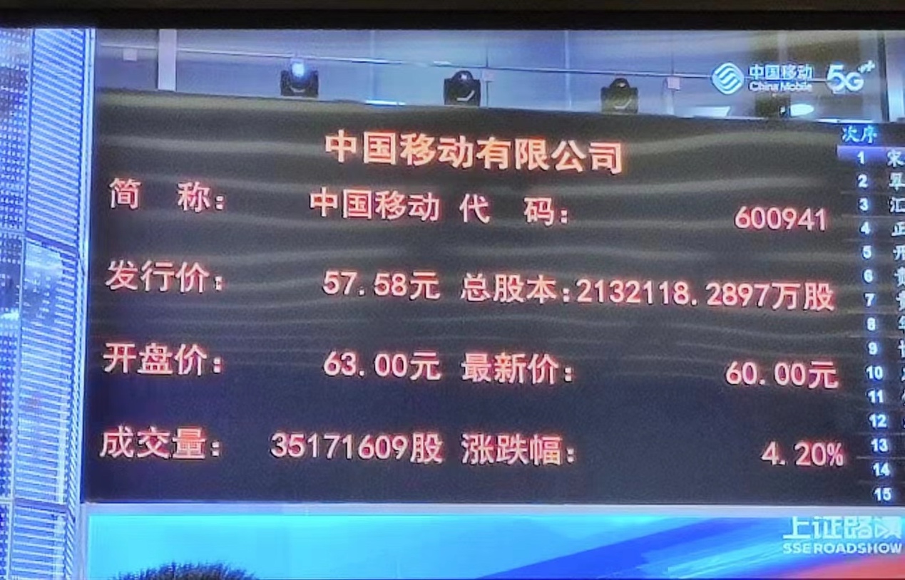 ICC訊 2022年開市第二天(1月5日),中國移動宣布正式登陸上交所主板,公司證券代碼為600941,發(fā)行價格57.58元/股,發(fā)行市盈率為12.09倍。今日中國移動開盤價為63元/股,高開9.41%。
