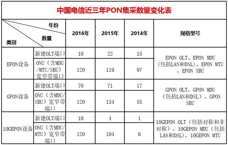 ICCSZ訊(編輯:Debi)3月8日,中國電信宣布啟動(dòng)2016年P(guān)ON設(shè)備集采,本次規(guī)模為:EPON新建OLT端口約10萬、ONU(含MDU/MTU/SBU)寬窄帶端口約120萬;GPON新建OLT端口約70萬、ONU(含MDU/SBU)寬窄帶端口約120萬;10G EPON新建OLT端口約10萬、ONU(含MDU/MTU)寬窄帶端口約120萬。從數(shù)量來看,今年的集采量與去年基本相當(dāng),EPON方面OLT量減少一半ONU量不變,GPON OLT量不變ONU減少14萬(10%),10GEPON的OLT和ONU量都在上升。