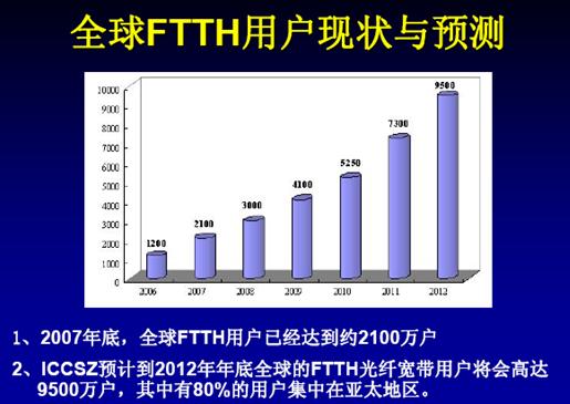 全球范圍內(nèi)FTTH經(jīng)歷了兩次發(fā)展契機,但都由于成本過高和市場需求缺乏而夭折了,自2003年開始,日本、美國。韓國、歐洲一些國家又開始了部署FTTH計劃,F(xiàn)TTH進入可第三次發(fā)展機遇期。其中又以日本的FTTH市場發(fā)展最快,2007年1月起日本FTTH用戶數(shù)已超越ADSL,以每8戶共享一條100Mbps的光纖來計算,每戶每月支付的服用與12Mbps的ADSL用戶每月支付費用幾乎持平。在FTTH用戶數(shù)方面,美國是隨日本之后的全球第二大市場,以美國為主的北美FTTH用戶覆蓋數(shù)已突破600萬,僅過去一年內(nèi)便增長了將近200萬。而在歐洲FTTH市場中,由于管理制度的不確定性以及缺少強大的市場市場驅(qū)動力,發(fā)展相對緩慢。