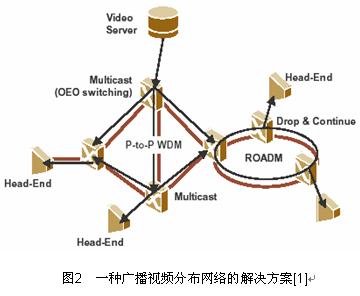 圖2表示一種廣播視頻分布網(wǎng)絡(luò)解決方案,包括 ROADM、OEO波長(zhǎng)開關(guān)和分出/繼續(xù)(Drop & Continue)。柔性是靈活光網(wǎng)的主要特征,ROADM 和 WXC 平臺(tái)是多媒體三重業(yè)務(wù)光網(wǎng)的關(guān)鍵部分。提高網(wǎng)絡(luò)的靈活性和降低建設(shè)成本和運(yùn)行維護(hù)費(fèi)用是發(fā)展中城域光網(wǎng)和接入光網(wǎng)的主要目標(biāo)之一。